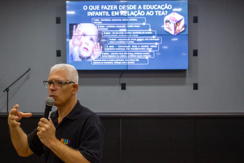 “A questão do autismo é muito atual e tem despertado o interesse de várias áreas, impactando muitas famílias. Por isso, é um assunto que precisa ser tratado principalmente pelos profissionais da educação, que são os primeiros a receber essas crianças nas escolas, os primeiros a lidar e até identificar esses casos de autismo, encaminhando essas crianças para um tratamento posterior”, destacou o palestrante.