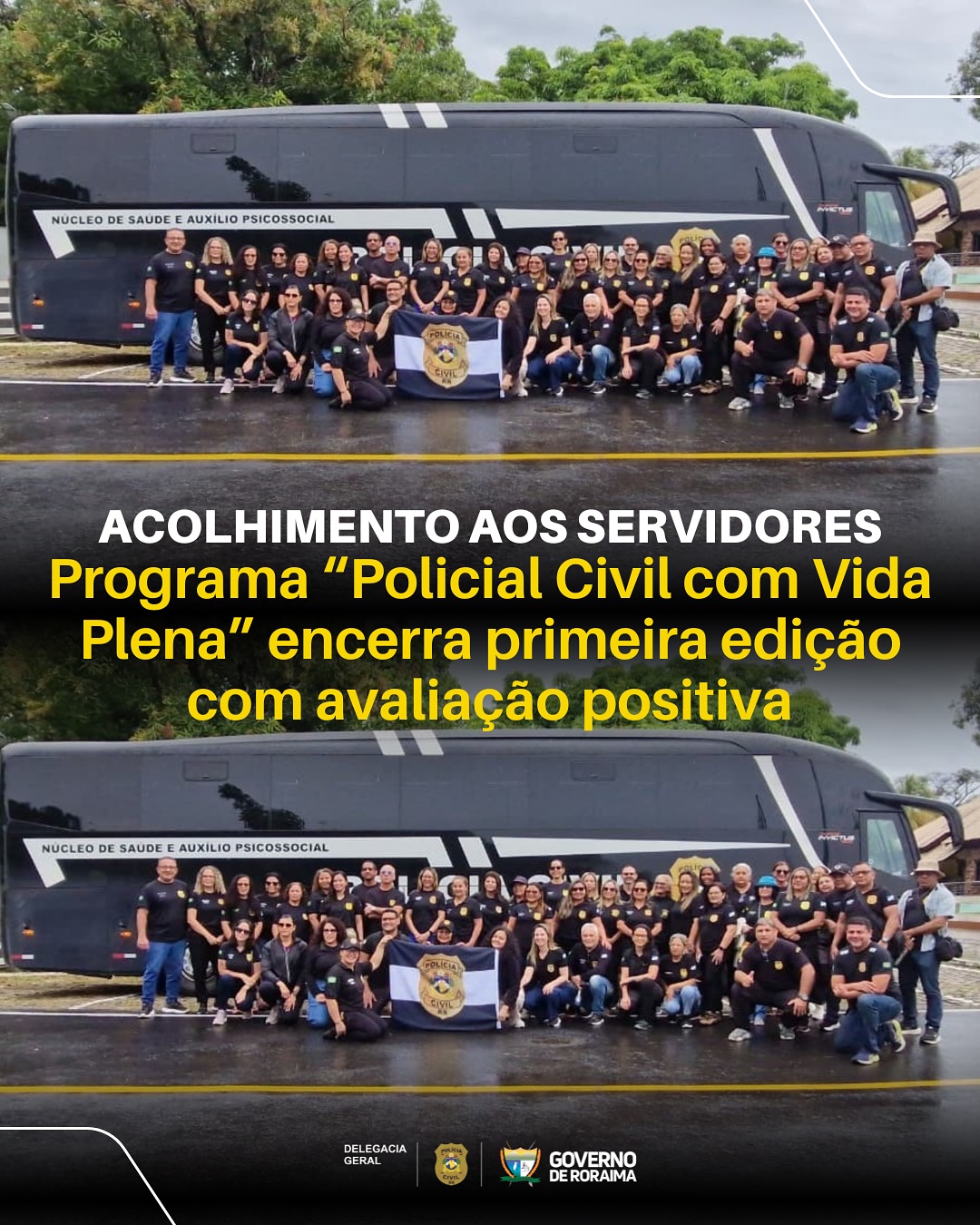 Com uma programação diversificada voltada ao bem-estar, valorização e saúde mental, a PCRR (Polícia Civil de Roraima) concluiu, nesta sexta-feira, dia 17, na Pousada do Sesc (Serviço Social do Comércio) em Tepequém, a primeira edição do programa “Policial Civil com Vida Plena”, uma iniciativa pioneira voltada aos servidores que estão próximos da aposentadoria.