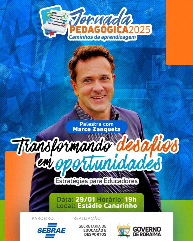 A ‘Jornada Pedagógica 2025 – Caminhos da Aprendizagem’, promovida pelo Governo de Roraima por meio da Seed (Secretaria de Educação e Desporto) encerra nesta quarta-feira, 29, com uma atração especial: a palestra show de Marco Zanqueta. A iniciativa conta com a parceria do Sebrae/RR (Serviço Brasileiro de Apoio às Micro e Pequenas Empresas de Roraima). […]