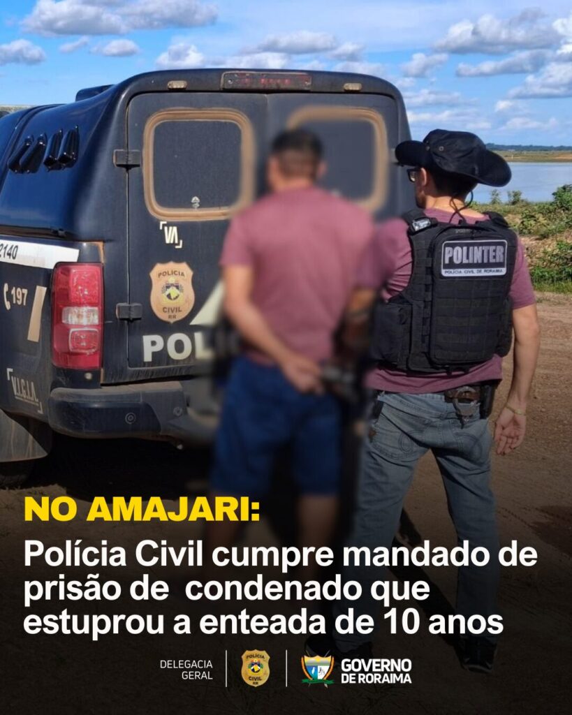 A Polícia Civil de Roraima, por meio da Polinter (Delegacia de Polícia Interestadual), cumpriu neste sábado, o mandado de prisão por sentença definitiva contra A. R. S. N., de 48 anos. Ele foi condenado pelo estupro da enteada ocorrido entre 2004 e 2006, na Comunidade Indígena do Aningual, em Amajari. Na época, a vítima tinha […]