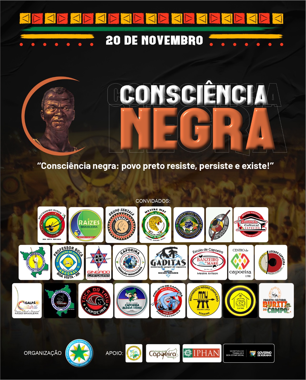 Sob a liderança do Mestre Ongira, a roda de capoeira será o ponto alto da celebração, resgatando uma tradição que já acontece há 19 anos em Roraima com o objetivo de honrar Zumbi dos Palmares e refletir sobre a luta pela igualdade racial. “A capoeira é resistência, é cultura, e nos conecta à nossa ancestralidade. Em um estado multicultural como Roraima, é essencial promover o respeito e a inclusão através da cultura e do diálogo”, afirma o mestre.