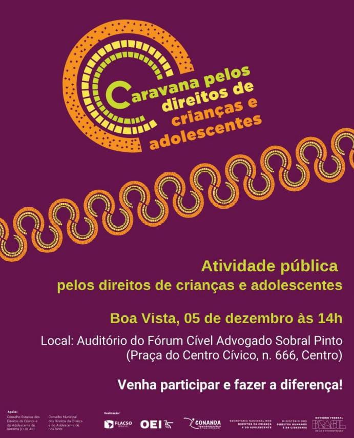 Com o objetivo de dialogar sobre os direitos das crianças e dos adolescentes, o projeto ‘caravanas’ chega nesta quinta-feira, 05 de dezembro, a Roraima.O projeto é executado pela Faculdade Latino Americana de Ciências Sociais – Flacso em parceria com o Conselho Nacional dos Direitos da Criança e do Adolescente – Conanda e Secretaria Nacional dos Direitos da Criança e do Adolescente do Ministério de Direitos Humanos e da Cidadania -MDHC,. O evento tem início a partir das 14h no auditório do Fórum Cível advogado Sobral Pinto, Praça do Centro Cívico. A entrada é aberta ao público.