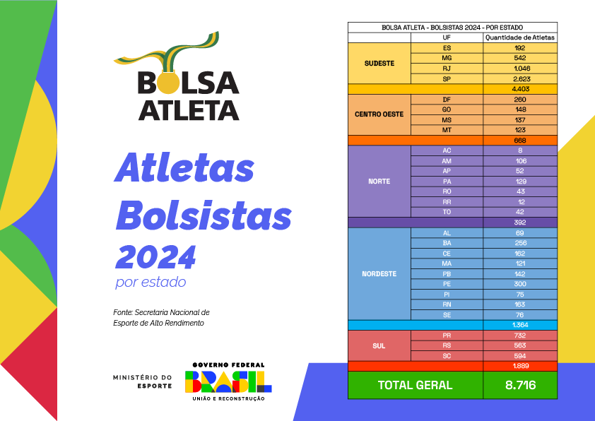 Desse total, 4.403 são esportistas da Região Sudeste; 1.889 da Sul; 1.364 do Nordeste; 668 do Centro-Oeste; e 392 da Norte. O montante de investimento para 2024 é de R$ 148,9 milhões.