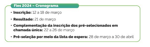 Lista de espera – Os candidatos não pré-selecionados na chamada única do processo seletivo do Fies constarão automaticamente na lista de espera, para fins de preenchimento das vagas eventualmente não ocupadas, observada a modalidade de vaga e a ordem de classificação conforme previsto no Edital nº 10/2024 , que trata do cronograma e de demais procedimentos do Fies 2024/1. A eventual pré-seleção dos candidatos participantes da lista de espera ocorrerá durante o período de 28 de março a 30 de abril, no Portal Único de Acesso.