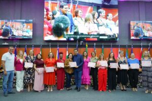 Elas foram agraciadas com um buquê de flores e menção honrosa por sua contribuição, dedicação, conhecimento e compromisso com o Poder Legislativo, pelas mãos da responsável pela pasta, deputada Joilma Teodora (Podemos), do presidente da ALE, Soldado Sampaio (Republicanos), e pelos deputados Angela Águida Portella (Progressistas) e Coronel Chagas (PRTB).