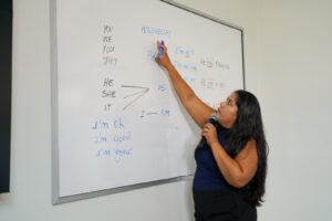 A turma vespertina do curso de Inglês Básico começou lotada e disposta a aprender uma nova língua. Nesse primeiro encontro, os estudantes tiveram noções básicas sobre início de uma conversação e participaram com muitas interações entre alunos e professora.