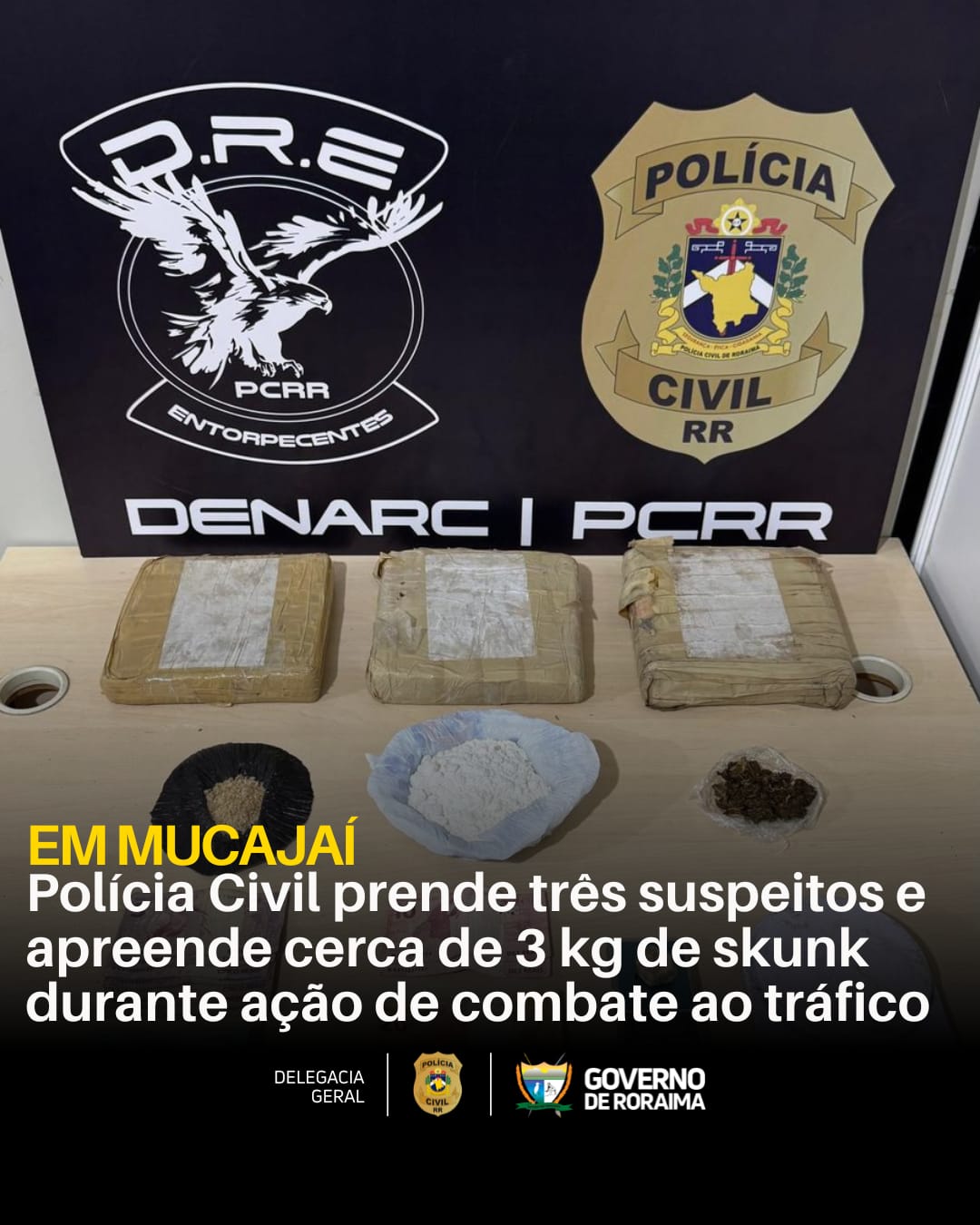 EM MUCAJAÍ: Polícia Civil prende três suspeitos e apreende cerca de 3 kg de skunk durante ação de combate ao tráfico