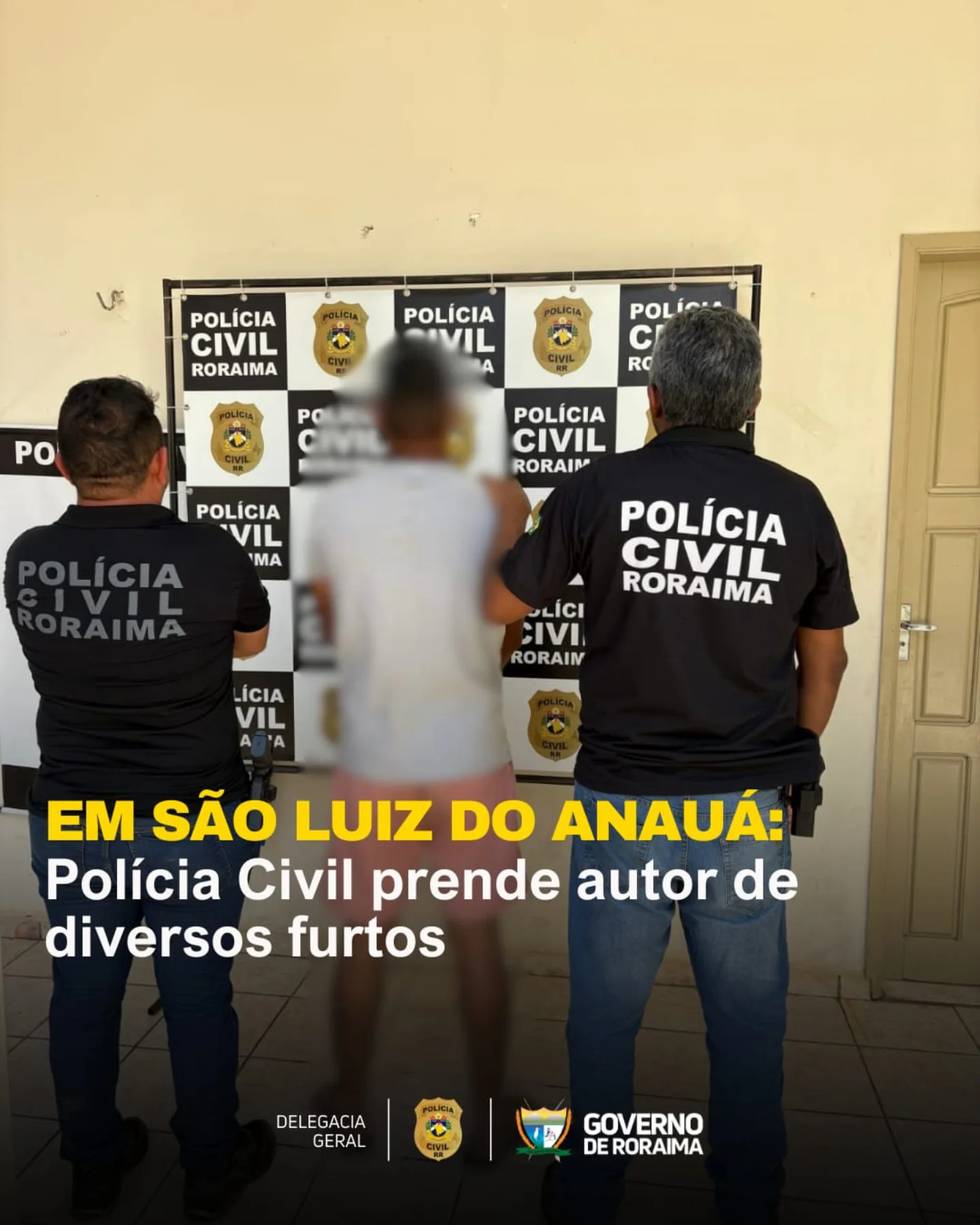 A PCRR (Polícia Civil de Roraima), por meio da Delegacia de São João da Baliza, realizou nesta segunda-feira, dia 15, a prisão de D.J.S., 27 anos, autor de furto praticado durante o repouso noturno em um estabelecimento comercial na feira de São Luiz do Anauá.