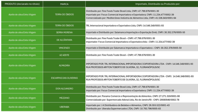 O Ministério da Agricultura e Pecuária (Mapa) determinou aos comerciantes, varejistas e atacadistas o recolhimento de dez marcas de azeites de oliva extravirgem para retirada de circulação: Terra de Óbidos; Serra Morena; De Alcântara; Vincenzo; Az Azeite; Almazara; Escarpas das Oliveiras; Don Alejandro; Mezzano; e Uberaba.