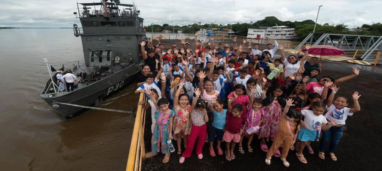 Crianças do CCJuv conhecem navio da Marinha aportado em Caracaraí para visitação