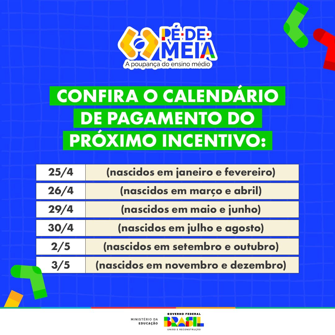 A partir do dia 25 de abril, o Ministério da Educação (MEC) começará a pagar a segunda parcela do programa Pé-de-Meia, referente à frequência dos estudantes da rede pública de ensino médio em fevereiro. Os depósitos, no valor de R$ 200, serão efetuados até 3 de maio, conforme mês de nascimento dos alunos que participam do programa, nas contas digitais abertas automaticamente pela Caixa Econômica Federal em seus nomes.