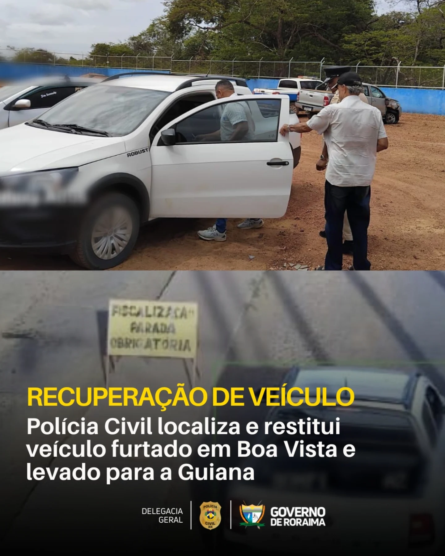 A PCRR (Polícia Civil de Roraima), por meio do 3º DP (Distrito Industrial), com apoio da DRRFVAT (Delegacia de Repressão a Roubos e Furtos de Veículos Automotores Terrestres), concluiu as investigações que resultaram na localização e restituição de um veículo modelo VW Saveiro Robust, de cor branca. O automóvel havia sido furtado na capital e foi localizado no município de Lethem, na Guiana. Duas pessoas foram identificadas como participantes do crime, mas até o momento não houve prisões.