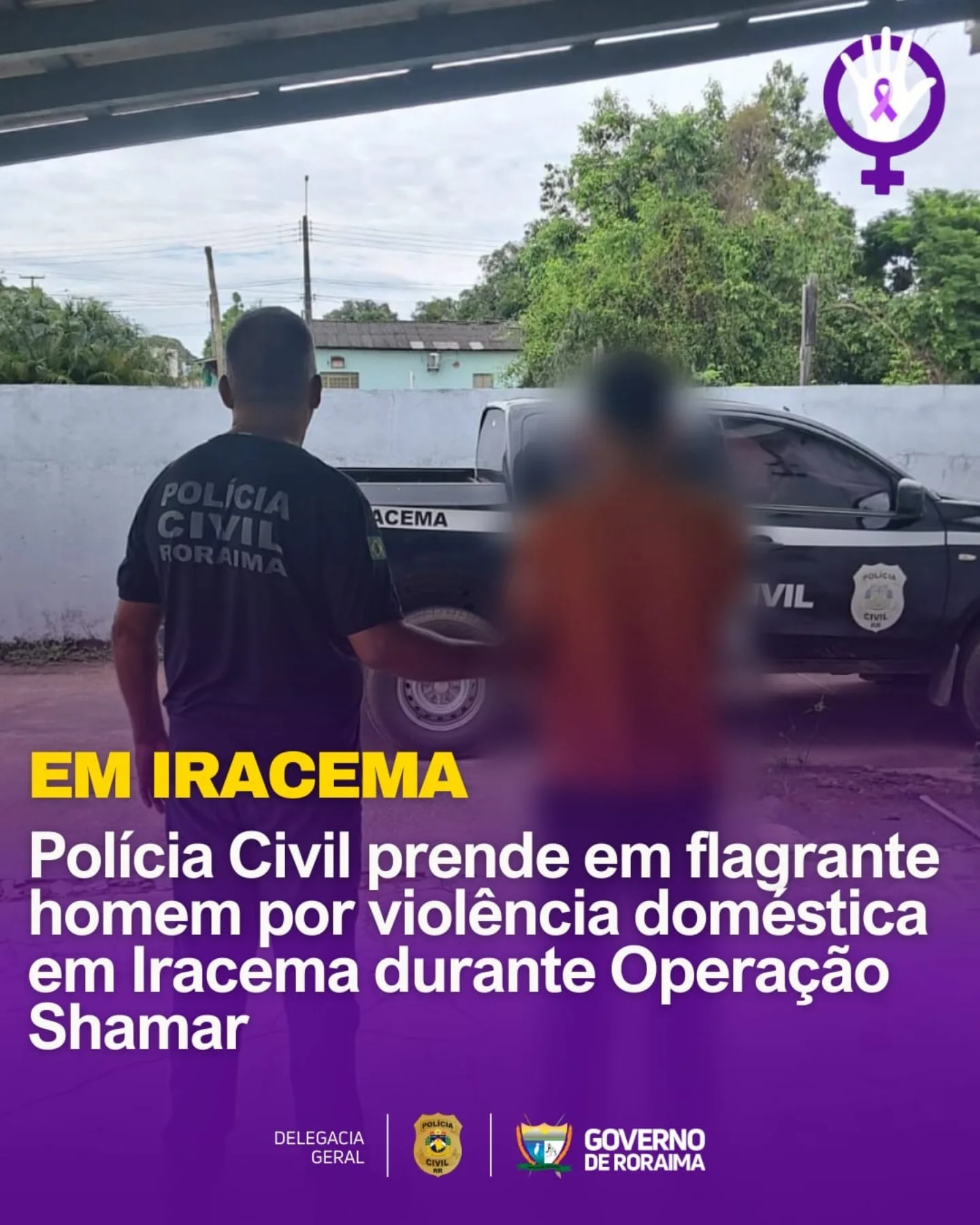 A Polícia Civil de Roraima, por meio da Delegacia de Iracema, realizou ontem, dia 20, a prisão em flagrante do pintor G. S. M., de 25 anos, acusado de agredir sua companheira, de 29 anos. O caso ocorreu no município de Iracema e integra as ações da Operação SHAMAR, voltada ao enfrentamento à violência contra a mulher.
