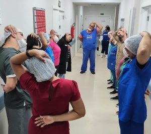 Além disso, as equipes das UTIs (Unidades de Terapia Intensiva) participaram de aulas de terapia intensiva com ginástica laboral, aromaterapia e auriculoterapia, visando à prevenção de estresse, ansiedade e relaxamento para os servidores.